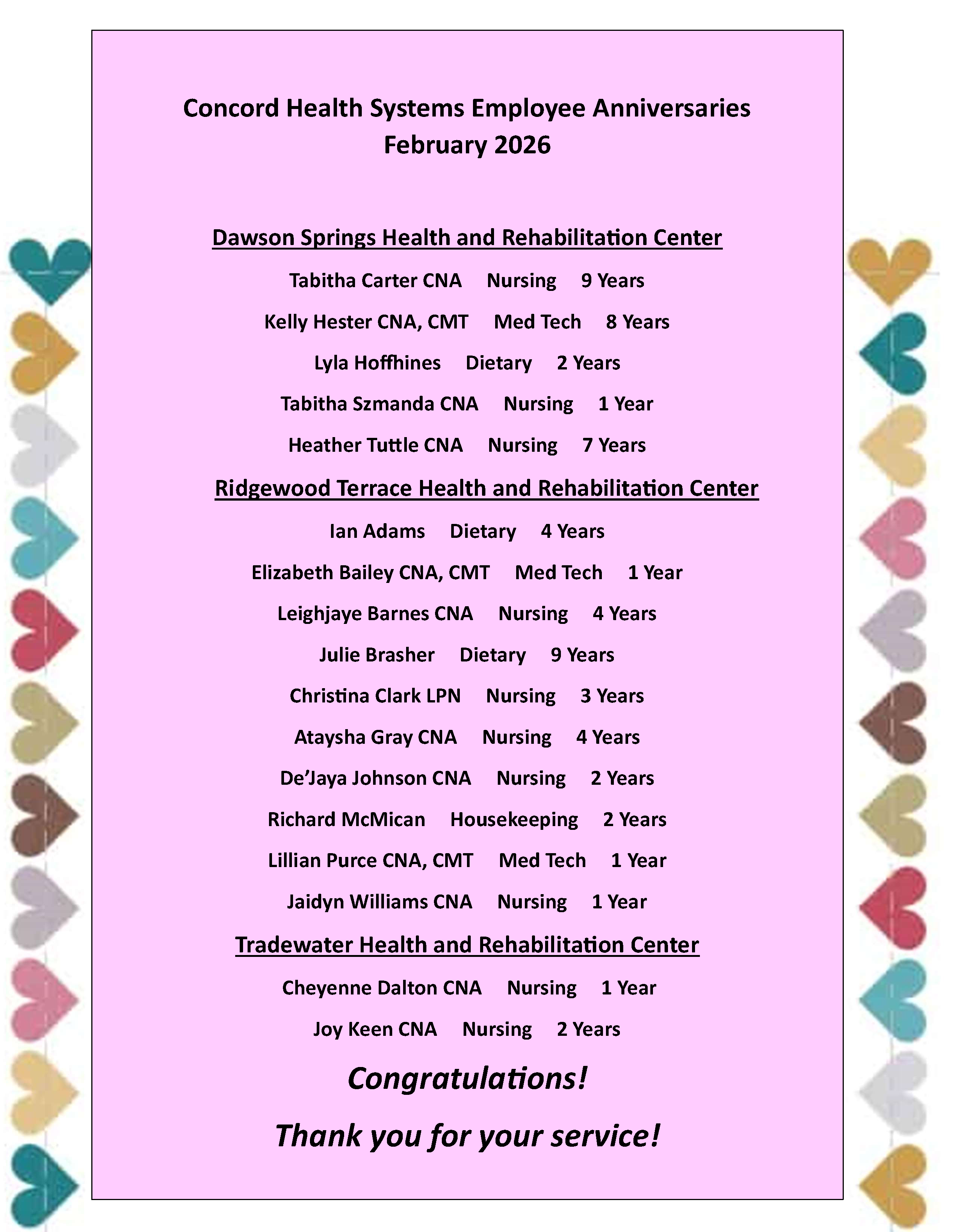 CHS Employee Anniversaries February 2026