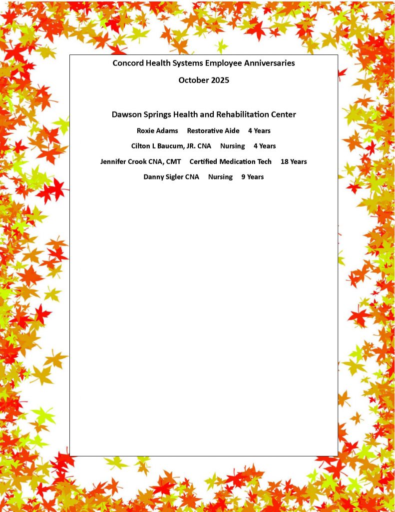 Dawson Springs Health and Rehabilitation Center is a member of the Concord Health Systems  family and is located in historic Dawson Springs, Kentucky. Dedicated professionals provide skilled care to individuals of all ages with developmental disabilities and/or behavioral issues.  Services are also available for geriatric residents with psychiatric needs.