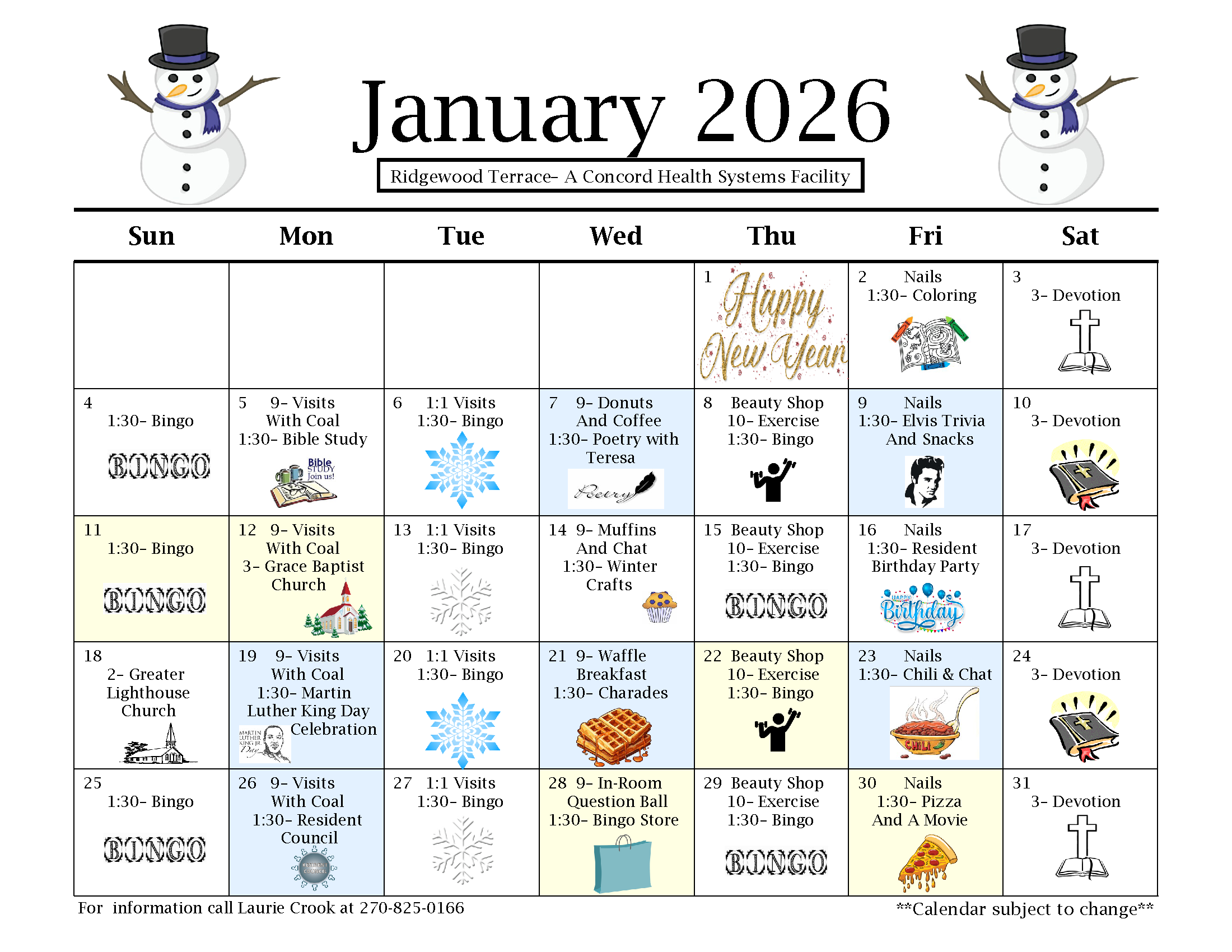 The Family Council is a welcomed presence in the facility. This volunteer group, comprised of residents’ family and friends, is actively promoted by facility staff.  The council works closely with the Administrator, Director of Social Services and the Activities Director to address resident/family concerns and present ideas to enhance resident care.  Volunteers play a vital role in facility operations by routinely bringing ‘sunshine’ to the residents and staff via visits, songs, food, games, crafts and religious services.  Events are coordinated and scheduled by the Activities Director, Laurie Crook.