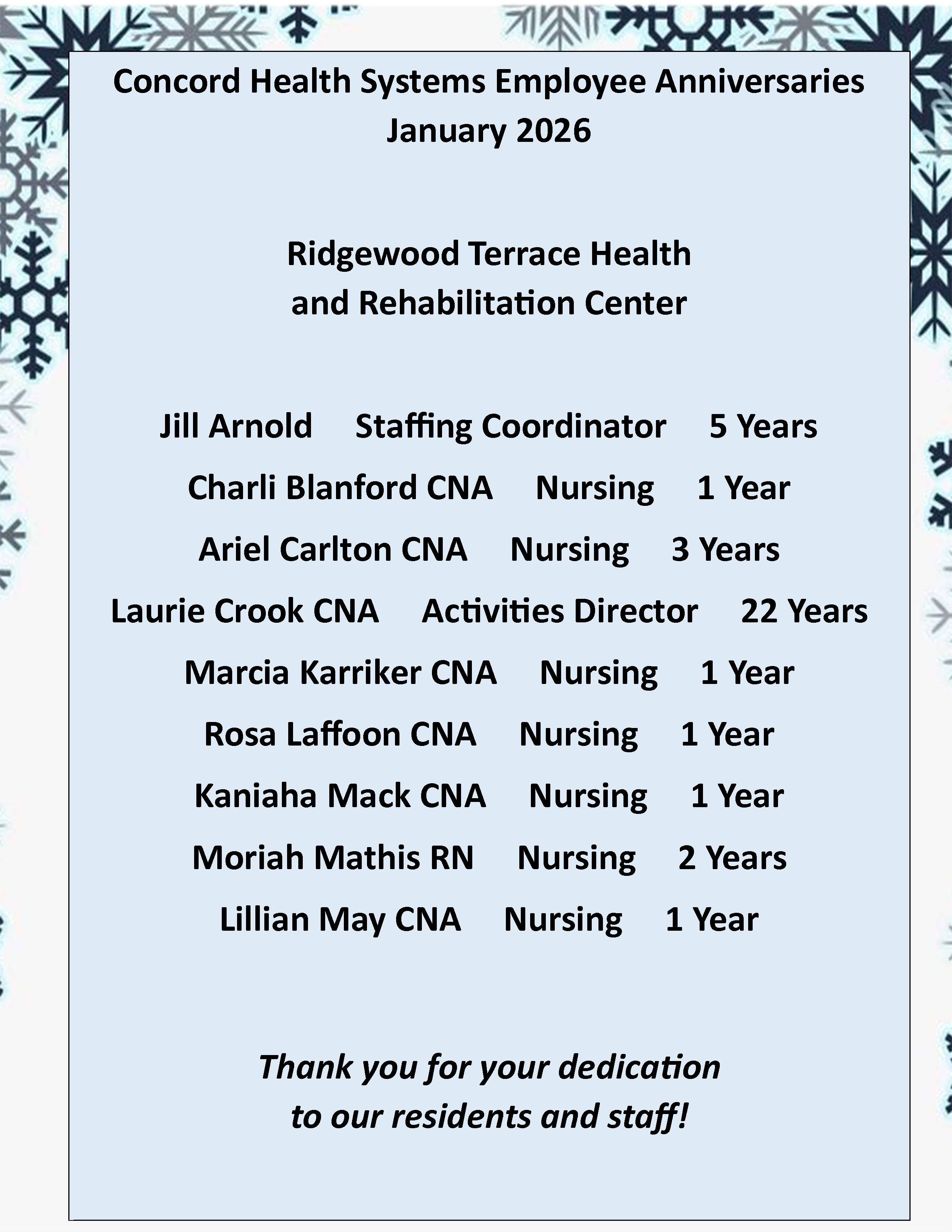 We invite you to visit  Ridgewood Terrace Health and Rehabilitation Center  and experience the Concord Health Systems approach to excellence in health care.
