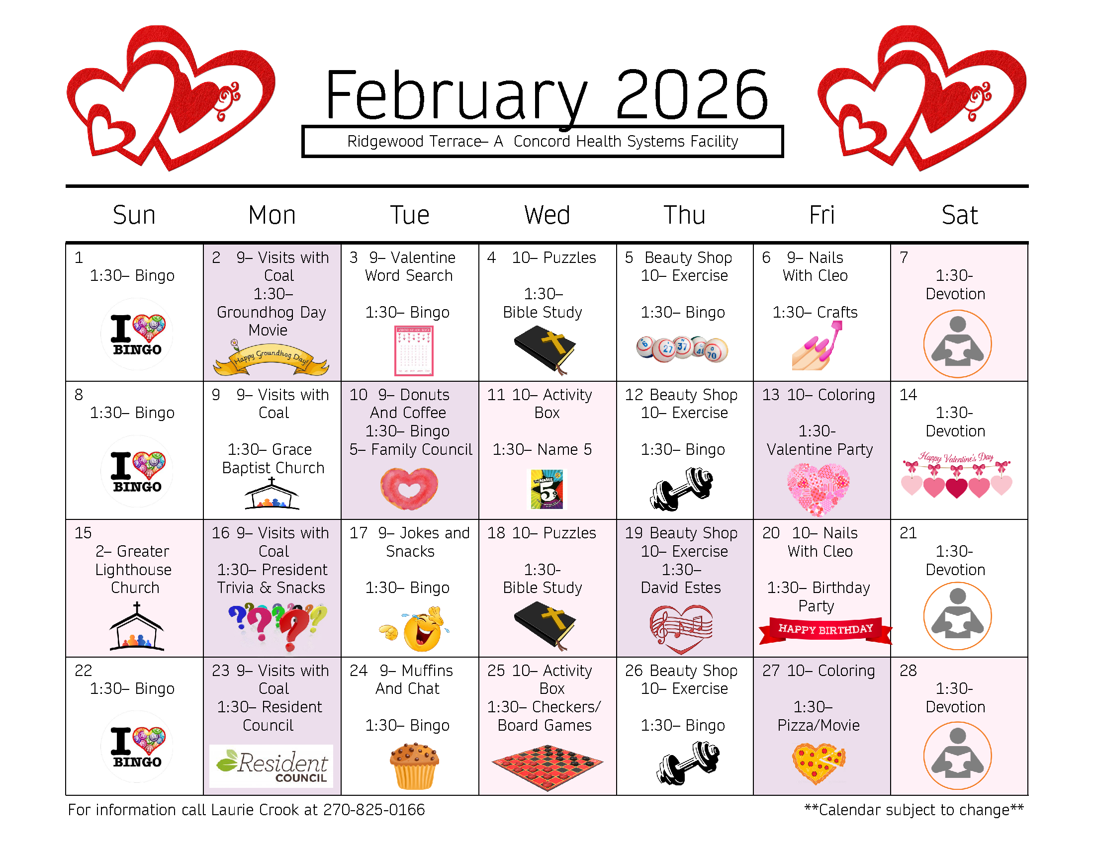 The Family Council is a welcomed presence in the facility. This volunteer group, comprised of residents’ family and friends, is actively promoted by facility staff. The council works closely with the Administrator, Director of Social Services and the Activities Director to address resident/family concerns and present ideas to enhance resident care. Volunteers play a vital role in facility operations by routinely bringing ‘sunshine’ to the residents and staff via visits, songs, food, games, crafts and religious services. Events are coordinated and scheduled by the Activities Director, Laurie Crook.