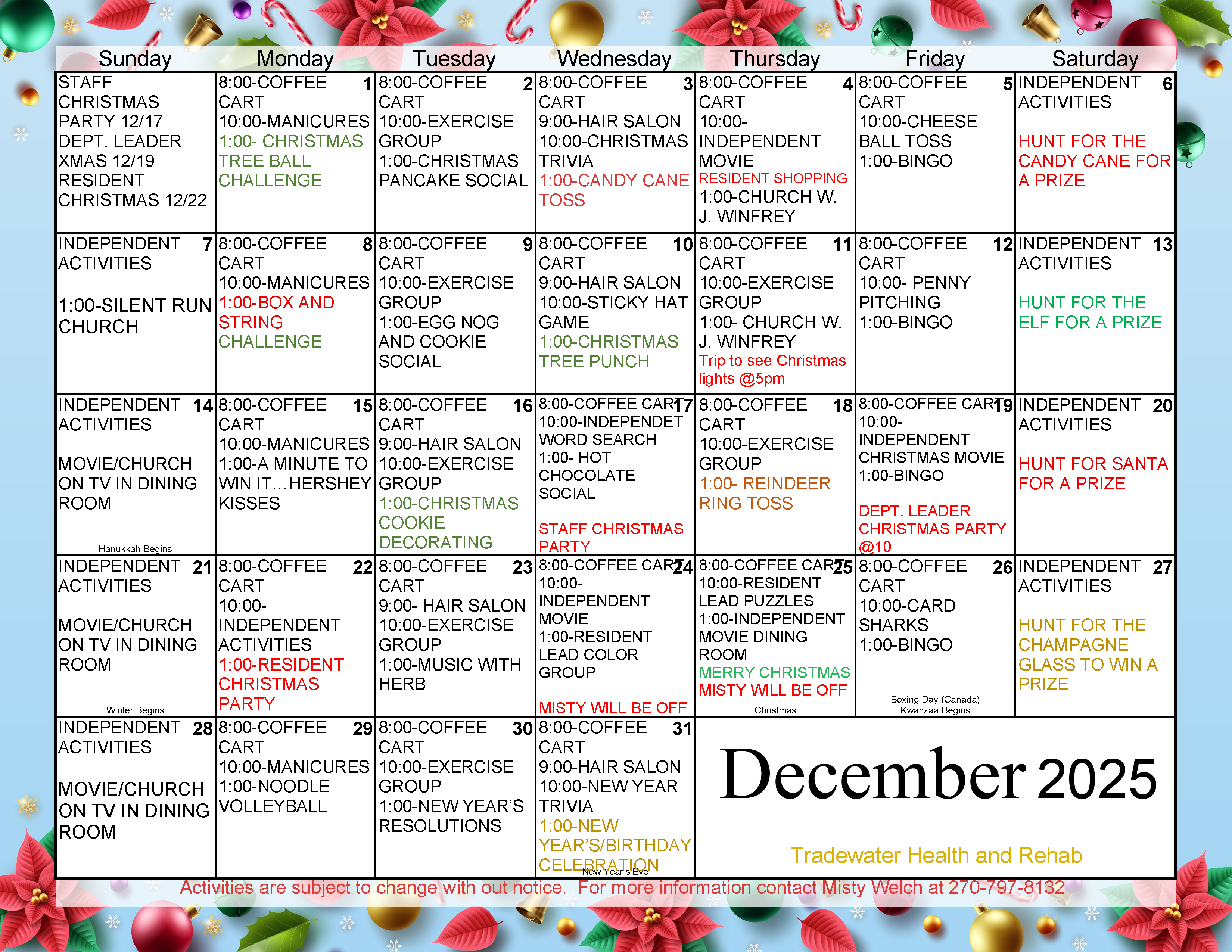 The Family Council is a welcomed presence in the facility. This volunteer group is comprised of residents’ family and friends. Council membership is actively promoted. The council works closely with the Administrator, Director of Social Services, and Activities Director to address resident concerns and present ideas to enhance resident care. Volunteers play a vital role in facility operations by routinely bringing ‘sunshine’ to residents via visits, songs, food, games, crafts and religious services.